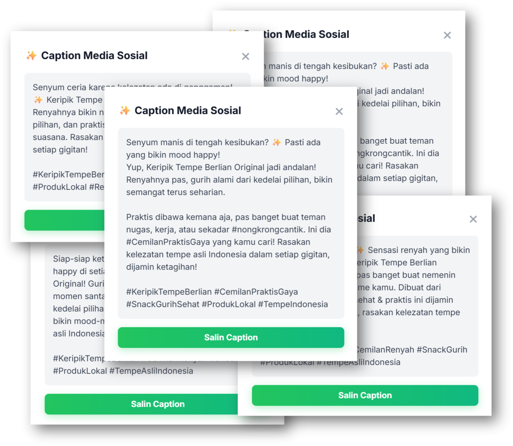 Sudah tercipta otomatis Copywriting & Hastag siap pakai dan siap posting disosial media. Gak perlu mikir, gak akan kehabisan ide mau posting apa hari ini!